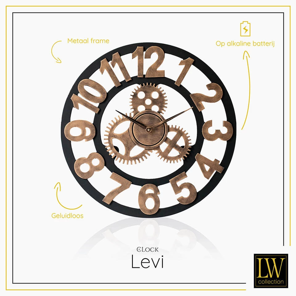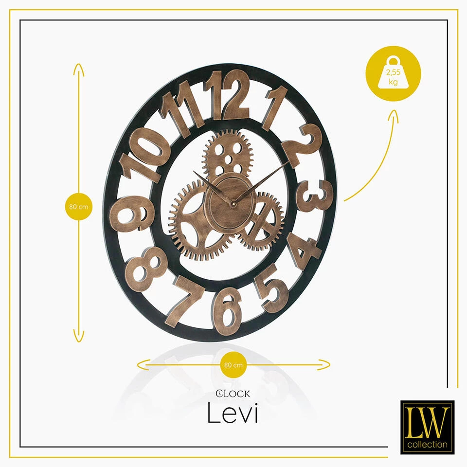 De muurklok met tandwielen is verkrijgbaar in 2 verschillende kleuren en verschillende formaten. De kleur zwart/brons/goud past goed bij diverse woonstijlen. Retro, industrieel, landelijk of modern. Muurklok LEVI maakt uw inrichting compleet!