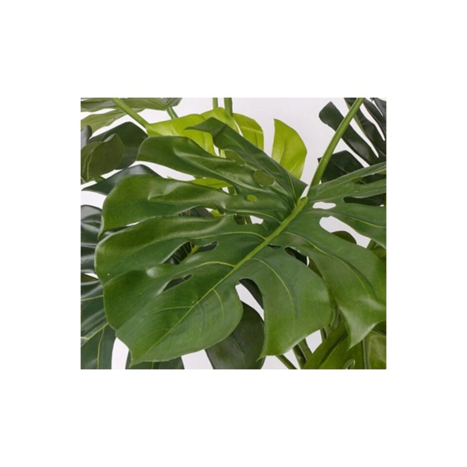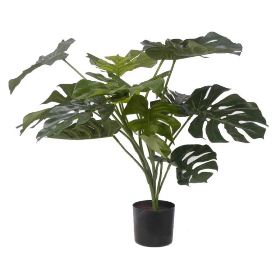 Groene Monstera kunstplant 85 cm voor binnen. Zeer realistisch uitziende, onderhoudsvrije/onderhoudsarme Monstera kunstplant met 15 polyester bladeren. Materiaal: kunststof/plastic. Formaat plant: 85 cm lang. Inclusief pot: ja. Nepplanten/kunstplanten woondecoraties voor in huis.