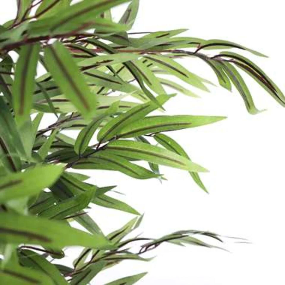 Klaar om zorgeloos te genieten? De kunstplanten voor binnen van Mica Decorations zijn niet van echt te onderscheiden, maar hebben geen enkel onderhoud nodig. Kenmerkend aan deze Bamboe zijn de langwerpige, tot in detail nagemaakte, groene blaadjes die gelijk voor een botanische sfeer in huis zorgen. Zeker in combinatie met de natuurlijke, donkerbruine stammen van echt hout! Zo is hij net echt. De kunstplant is stevig verankerd in een zwarte kunststof pot, maar moet voor gebruik wel nog in model worden gebracht. De vuistregel hierbij is: het blad moet je aankijken. Zet hem na het uitvouwen zo neer, of gebruik de kunststof pot als stevige basis voor een sierlijke overpot. Combineer hem met andere kunstplanten en -bloemen uit de collectie en breng meer groen in huis. Na het uitvouwen is de Bamboe 120 cm hoog met een diameter van 65 cm.