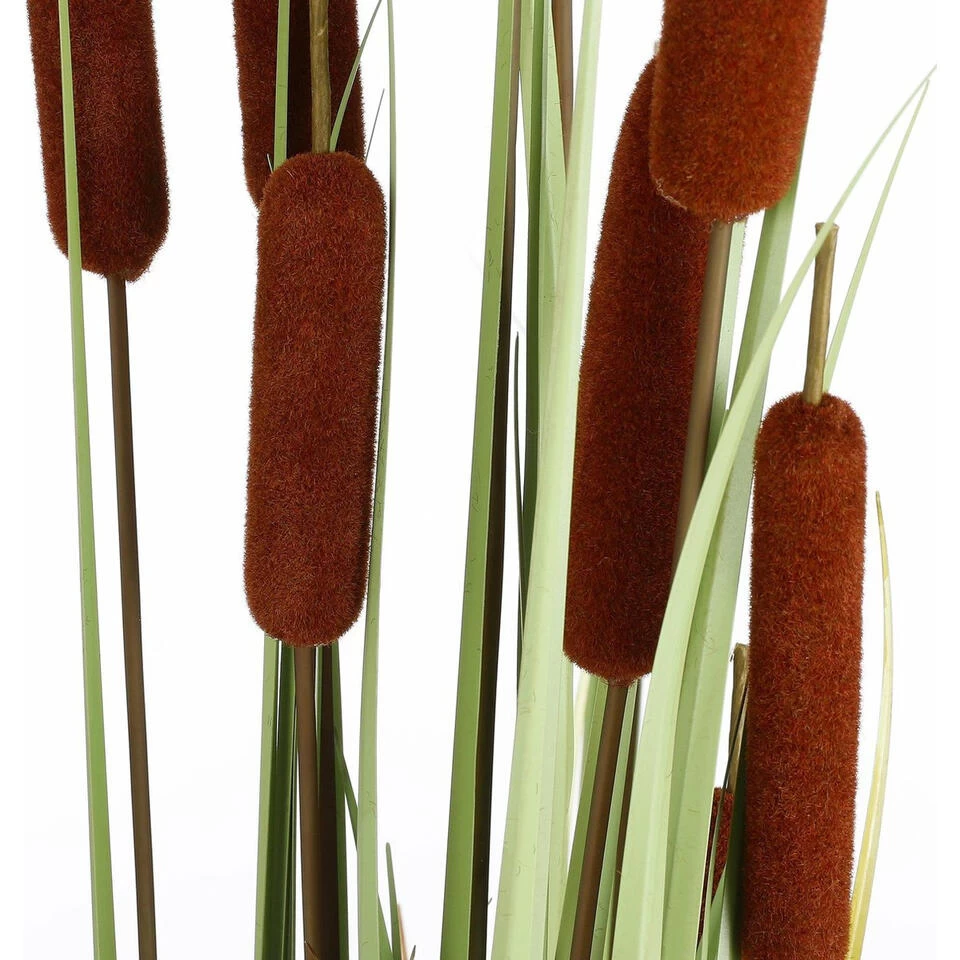 Kunstgras/rietgras/pluimgras Lisdodde kunstplant tak/losse steel in het groen/sigaar pluim van ongeveer 104 cm. Hoogte stengel tot begin van het gras is 33 cm. Breedte: 10. Gemaakt van pvc, voor binnen gebruik. Niet van echt te onderscheiden. Zet meerdere stelen in een vaas of als losse steel in een boeket met andere bloemen en takken of met een andere grasplant als uitbreiding. Wordt mooier per meer stuks.