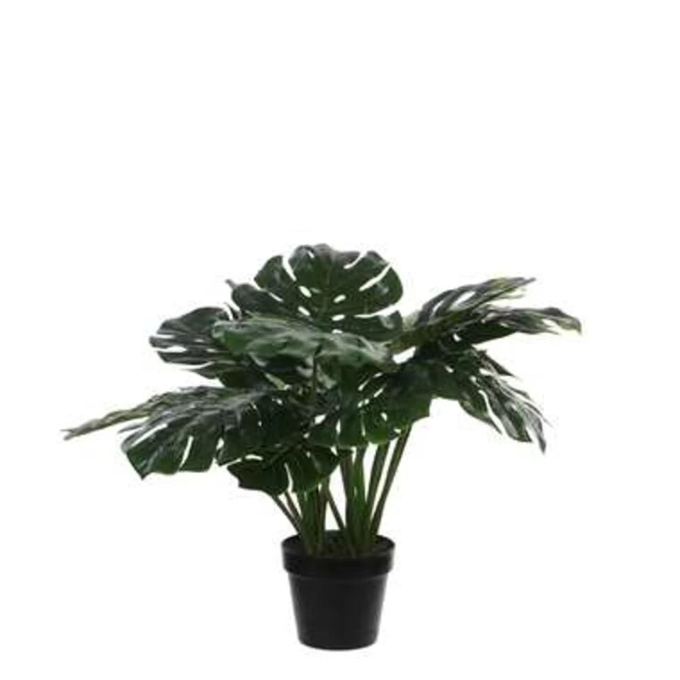 Monstera kunstplant van H50 x Ø70 cmTrendy ronde bladeren met gatenTot in detail nagemaaktGemaakt van polyester, dus onderhoudsvrijWordt geleverd in een terracotta pot van H14,5 x Ø17 cmKlaar om zorgeloos te genieten? De kunstplanten van Mica Decorations zijn niet van echt te onderscheiden, maar hebben geen enkel onderhoud nodig. De Monstera, oftewel gatenplant, is misschien wel de meest populaire kunstplant uit de collectie. De plant met zijn karakteristieke bladeren zorgt voor een botanische sfeer. Het opvallende blad van deze Monstera heeft een satijnzachte glans, net zoals de planten uit de natuur dat hebben. De plant is 60 cm hoog en stevig verankerd in een zwarte kunststof pot, wat een perfecte basis is voor in een mooie overpot. Combineer hem met andere kunstplanten en -bloemen uit de collectie en breng meer groen in huis.