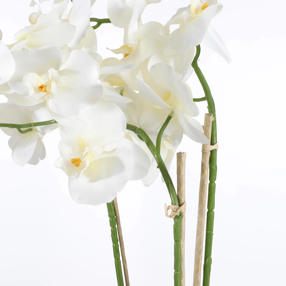 Phalaenopsis kunstplant van L45 x B28 x H50 cmBestaat zowel uit bloeiende, crèmekleurige bloemen als knoppenEcht tot in detail nagemaakt!De plant zit in een kunststof pot met een doorsnee van 12 cmGemaakt van polyester en onderhoudsvrijVrolijk je huis op met deze crèmekleurige Phalaenopsis uit de collectie van Mica Decorations. Niets is fleuriger dan een plant die de bijnaam vlinderorchidee heeft! De bloemen zijn vastgelegd in verschillende groeistadia: zowel in bloei als in de knop. De stelen worden, net als bij een echte Phalaenopsis, met takken ondersteund. De Phalaenopsis heeft geen onderhoud nodig en laat je het hele jaar door genieten. De plant is stevig verankerd in witte, keramieken pot. Zo kun je hem gelijk neerzetten! Of gebruik de pot als stevige basis voor een sierlijke overpot. Combineer de plant met andere kunstplanten en -bloemen uit de collectie en breng meer groen in huis.