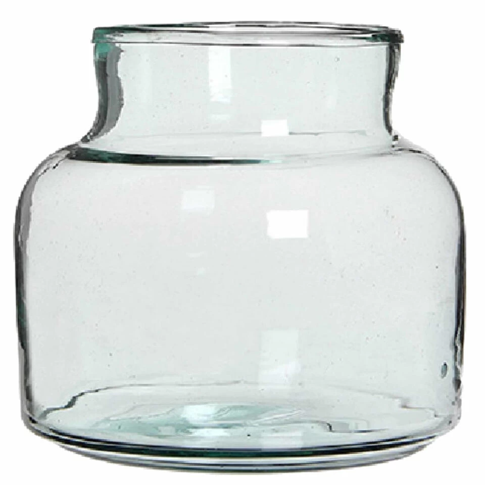 Transparante lage melkbus vaas/vazen van glas 20 x 21 cm. Rechte korte/lage melkbusvormige vaas. Geschikt om een klein boeket of losse bloemen in te plaatsen, maar ook leuk met (seizoensgebonden) decoratie.