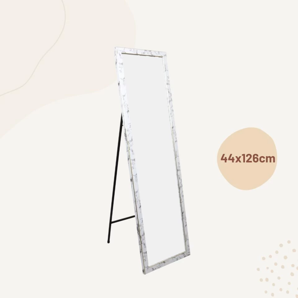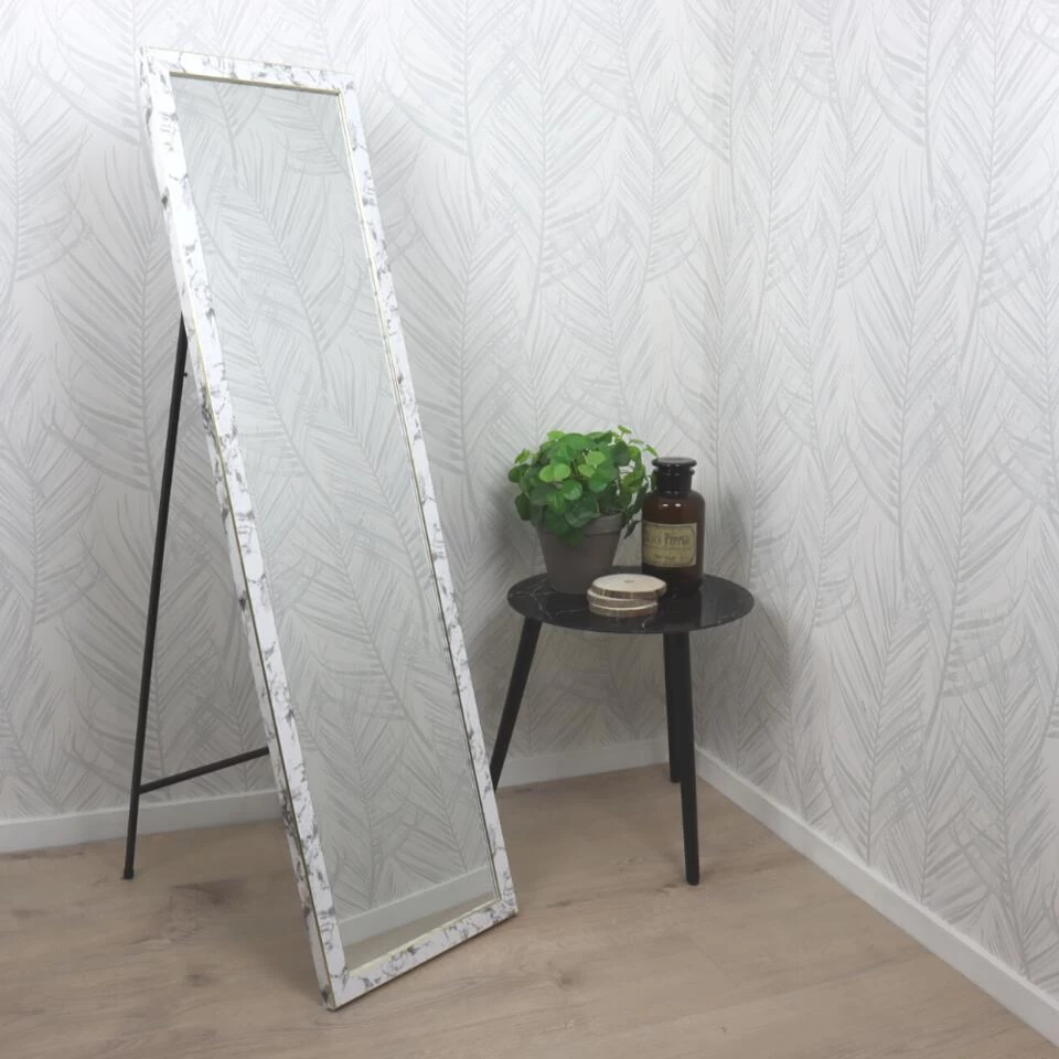 Passpiegel met wit marmeren frame. De spiegel is geschikt voor in de kinderkamer. De hoogte van spiegel is 126 cm. De poot is verstelbaar waardoor de spiegel in verschillende hoeken is neer te zetten.