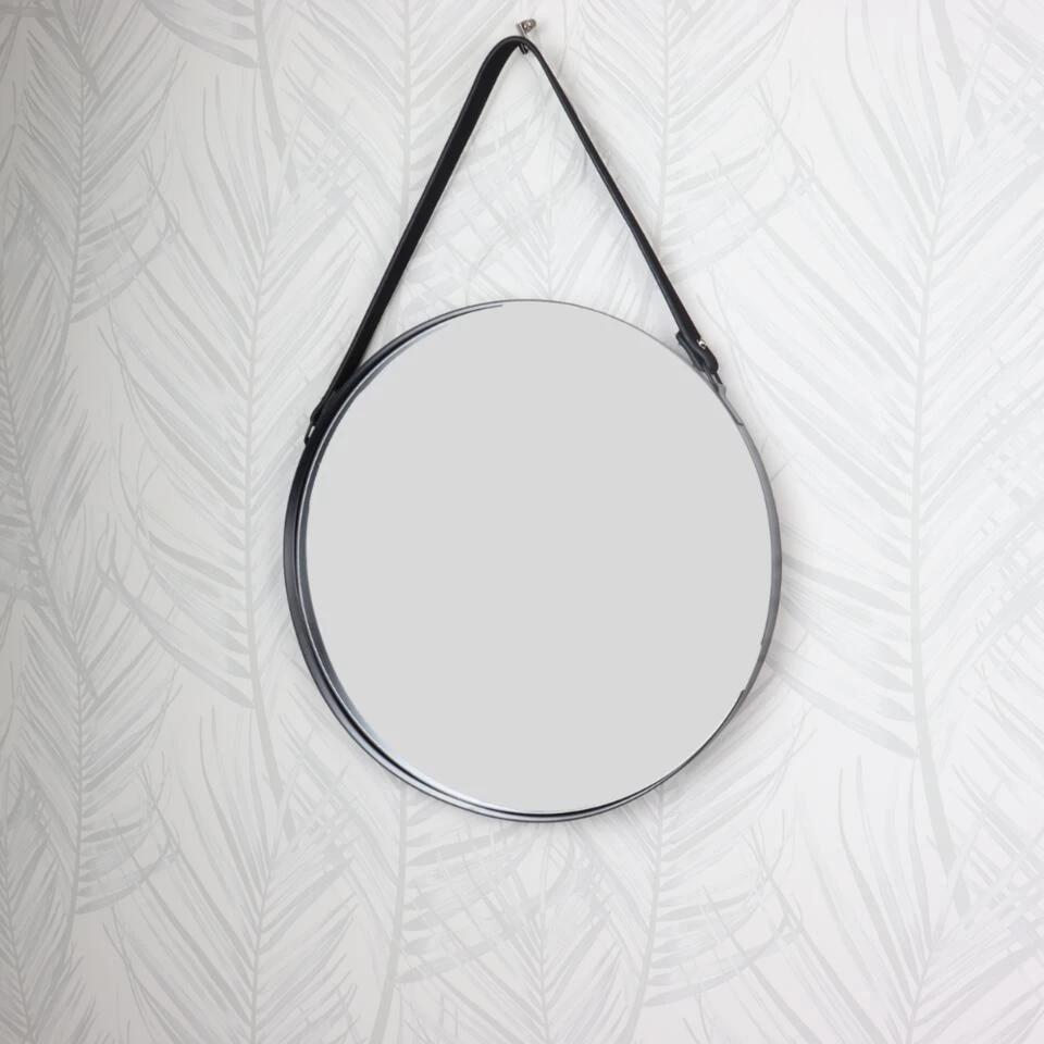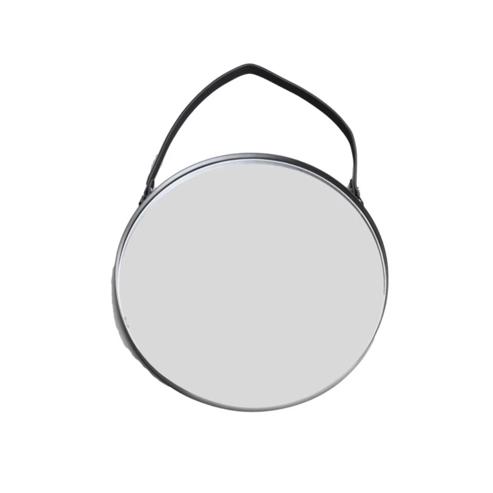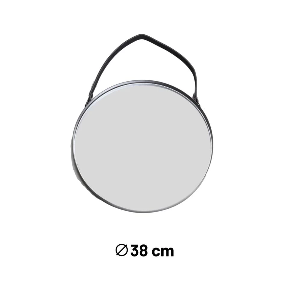 De Orange85 spiegel met riem is een stijlvolle spiegel. Aan de bovenkant van de spiegel is een riem vast gemaakt waar de spiegel aan opgehangen kan worden. Het heeft een zwarte kleur en is gemaakt van ijzer, glas en polyurethaan. De spiegel heeft een diameter van 38cm.