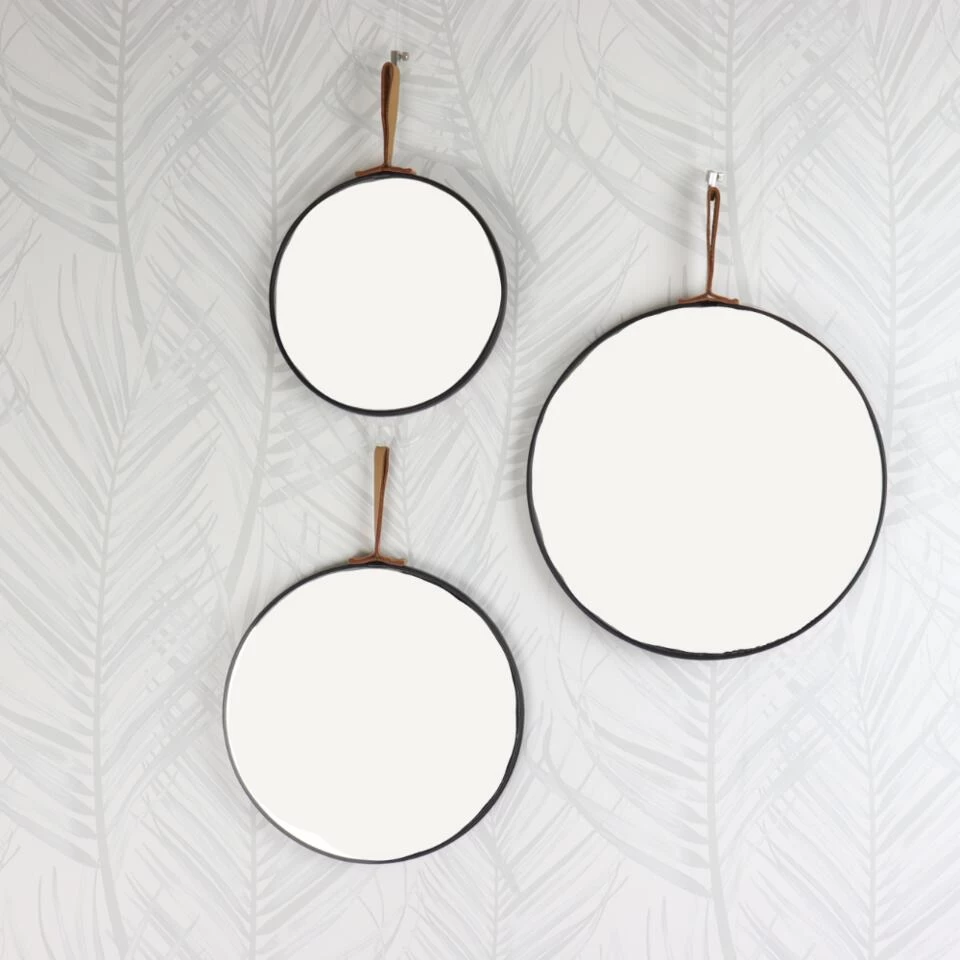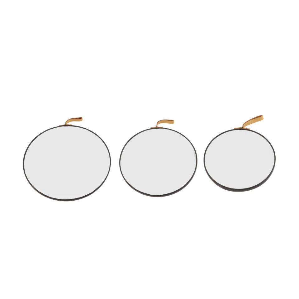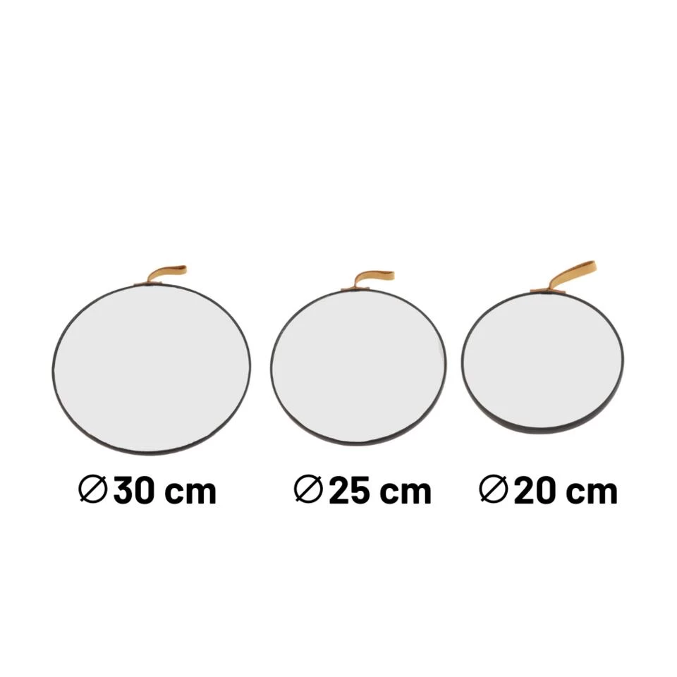 De Orange85 spiegel set bestaat uit drie ronde spiegels. De grootste spiegel heeft een diameter van 30cm. De middelste maat heeft een diameter 25cm en de kleinste maat heeft een diameter van 20 cm. Om de spiegel zit een zwarte rand en aan de boven kant een hangsysteem.