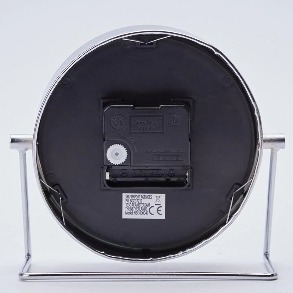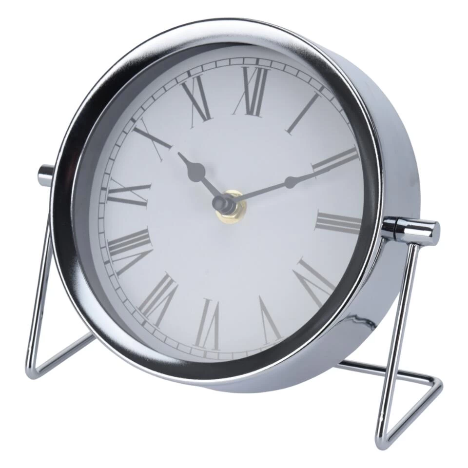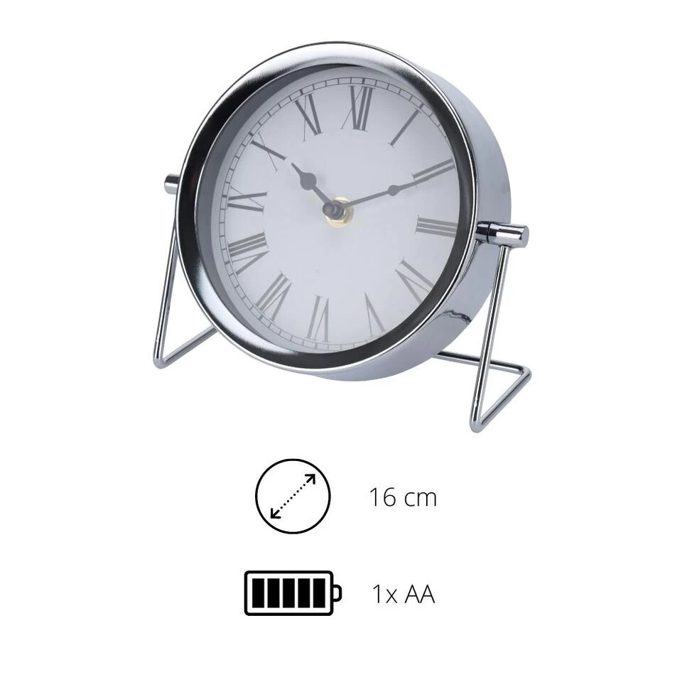 Klassieke Tafelklok zilver van Orange85. De klok staat op een standaard en kan versteld worden. Het model is uitgevoerd in een klassieke stijl, en heeft een contrasterende zwart-witte wijzerplaat met grote Romeinse cijfers. De diameter van de klok is 16 cm. De klok werkt op 1x AA batterij, deze is niet meegeleverd.