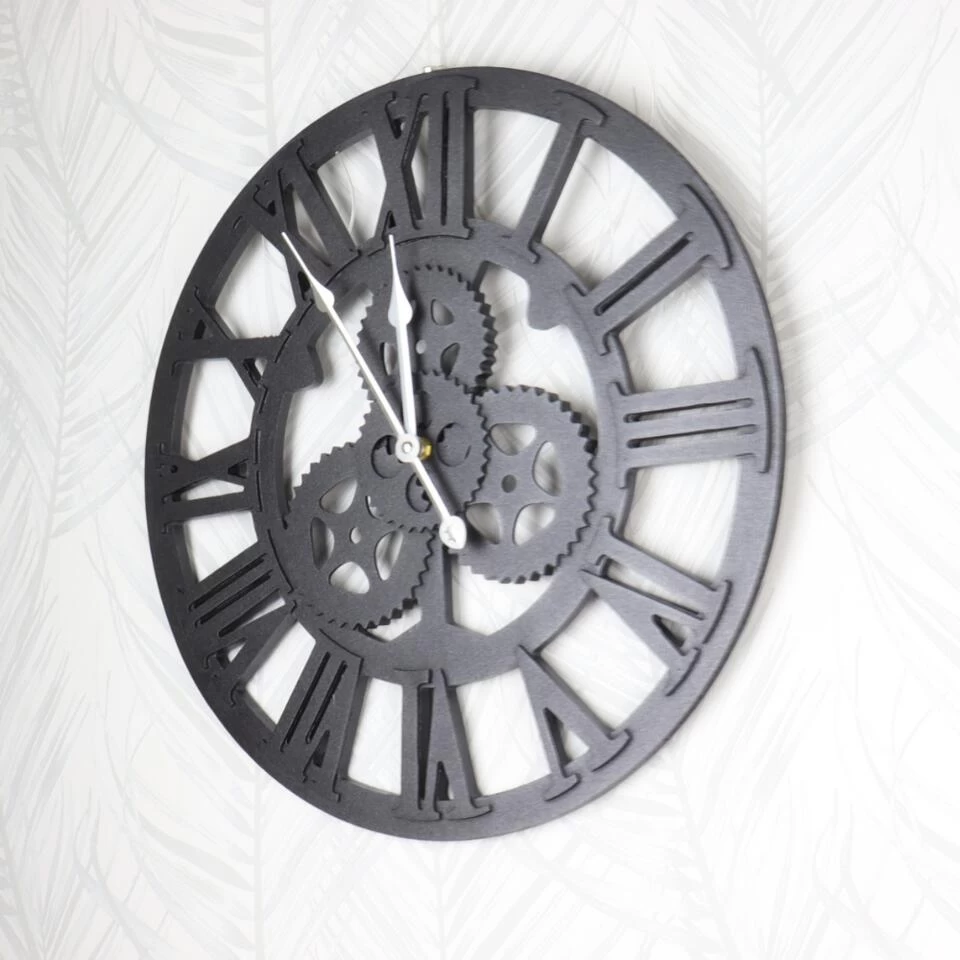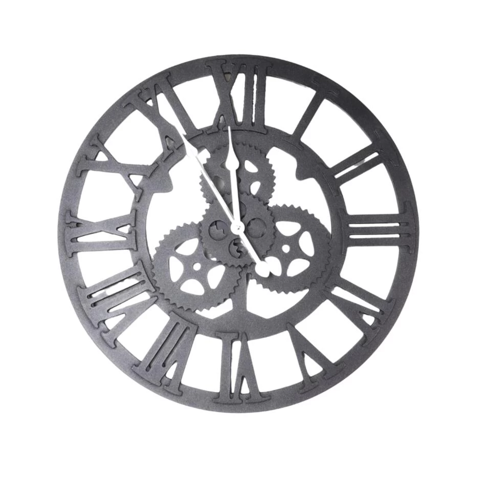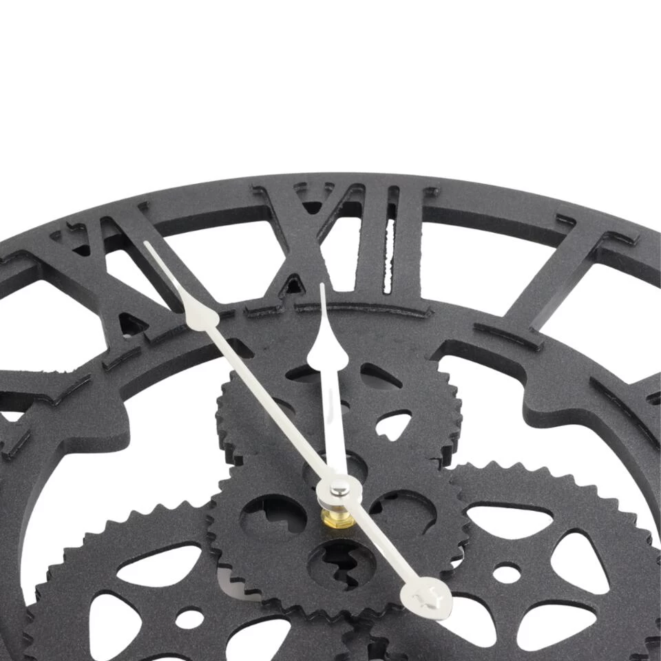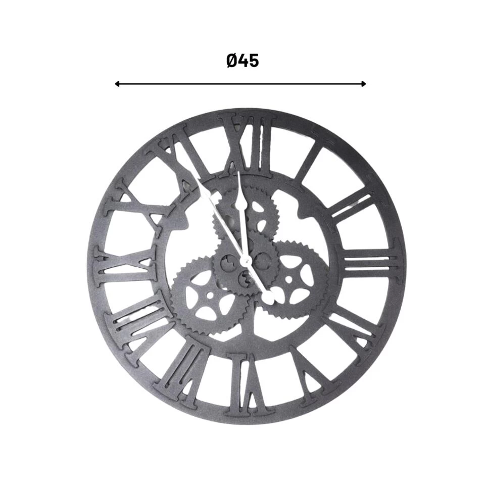 Wandklok van Orange85 heeft een diameter van 45 cm. De klok is in industriële stijl met tandwielen. De kleur van de klok is zwart. De klok werkt op 1 x AA-batterij. Deze wordt niet meegeleverd.