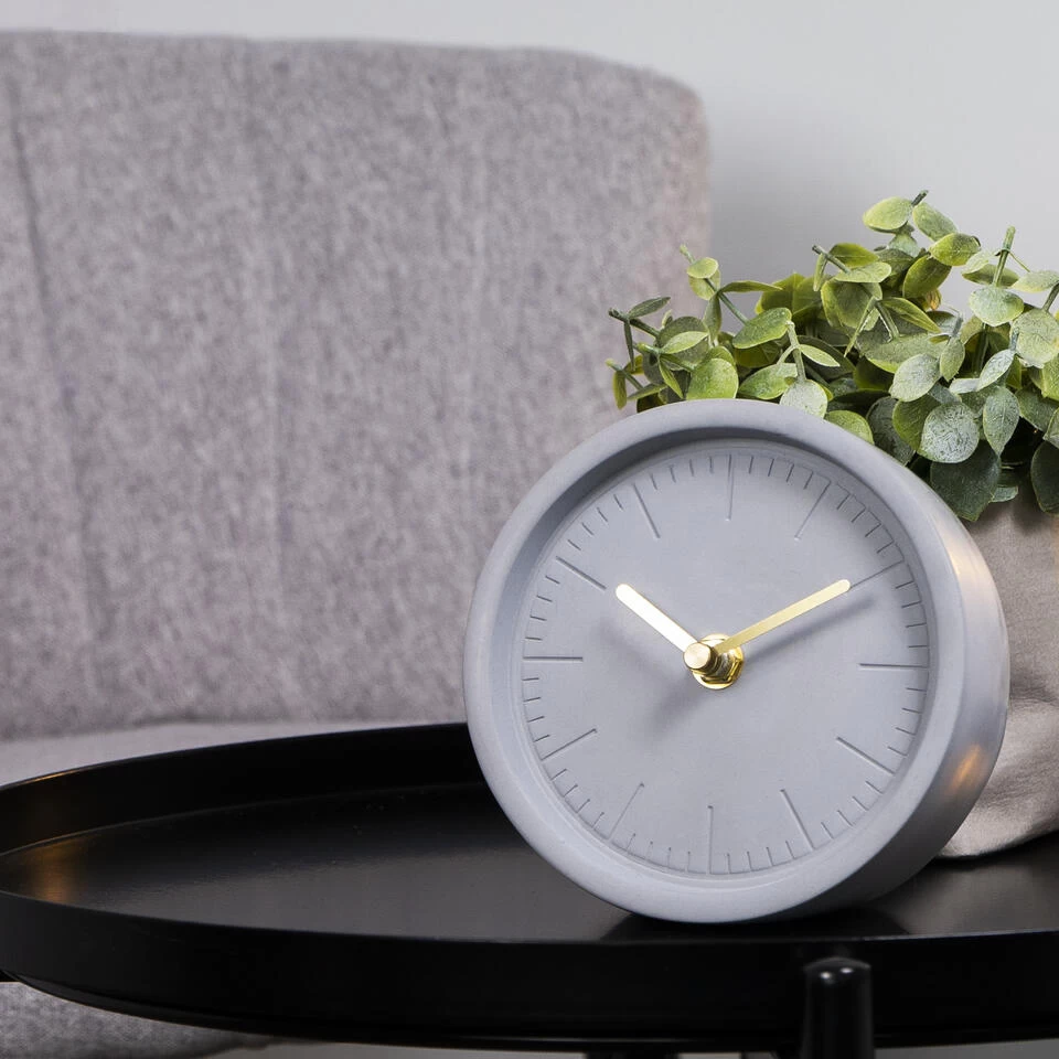 De klok heeft een diameter van 13 cm en een diepte van 5,8 cm,waardoor hij altijd stabiel staat. De grijze kleur van het beton en het goud van de wijzers zorgen voor een hele aparte uitstraling,waardoor deze klok in het hele huis geplaatst kan worden.