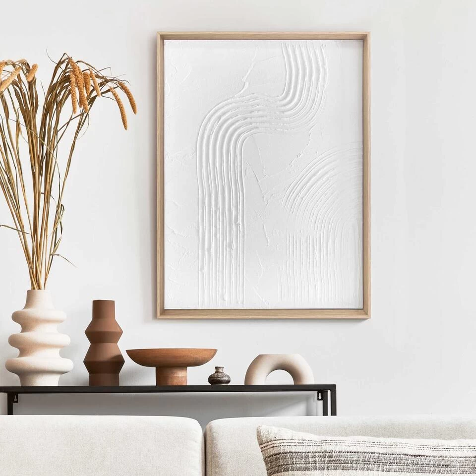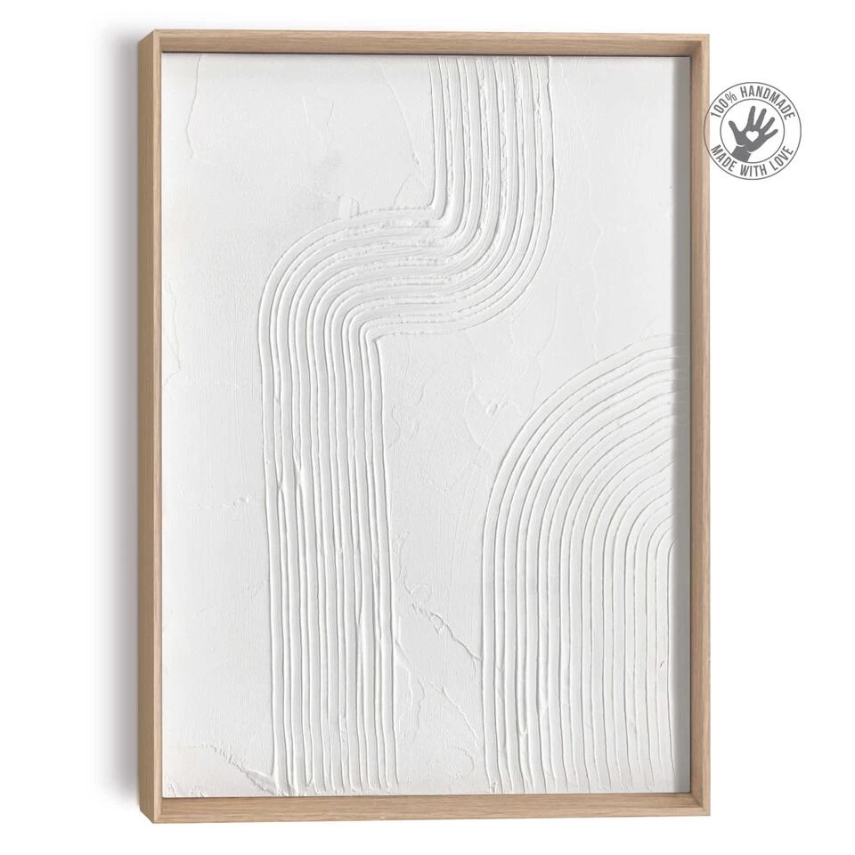 Handgemaakte wanddecoratie met abstract reliëf in wit gips omkadert door een houten lijst. Het scandinavisch minimalisme met 3d-textuur past in de meeste moderne woonstijlen zoals basic, vintage, urban of industrieel.Kenmerken