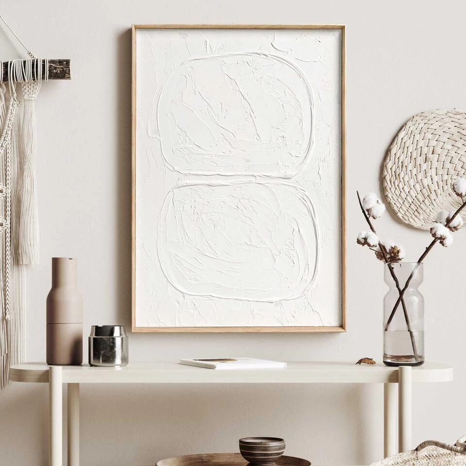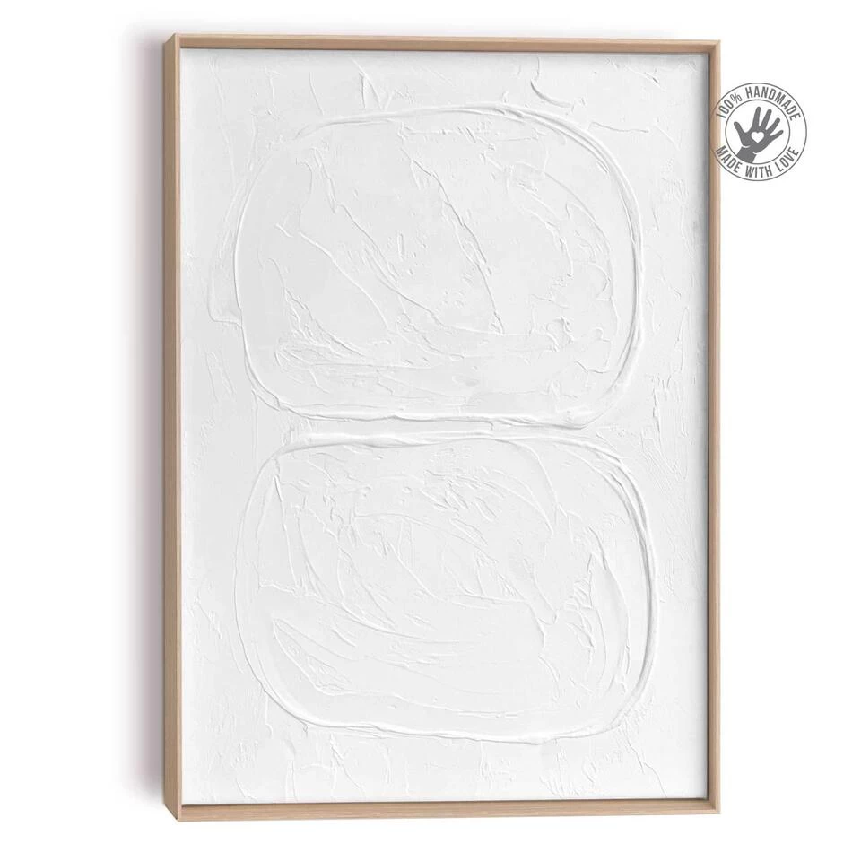 Handgemaakte wanddecoratie met abstract reliëf in wit gips omkadert door een houten lijst. Het scandinavisch minimalisme met 3d-textuur past in de meeste moderne woonstijlen zoals basic, vintage, urban of industrieel.Kenmerken