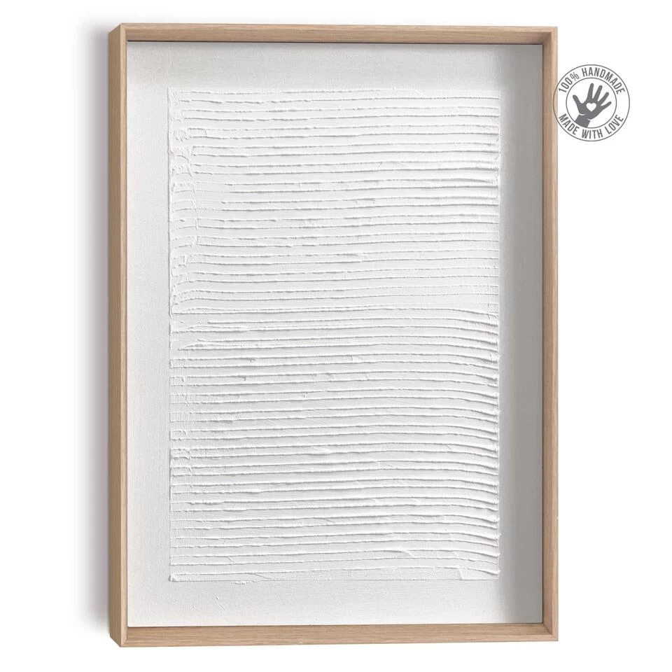 Handgemaakte wanddecoratie met abstract reliëf in wit gips omkadert door een houten lijst. Het scandinavisch minimalisme met 3d-textuur past in de meeste moderne woonstijlen zoals basic, vintage, urban of industrieel.Kenmerken