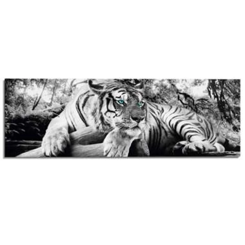 Bewerkte zwart-wit foto van een liggende tijger met groene ogen in een bos. Dit schilderij bestaat uit een poster die verwerkt is op een 3mm dikke plaat uit MDF. Op de achterkant is een solide raamwerk aangebracht van maar liefst 2cm dik. Hieraan kan deze muurdecoratie eenvoudig worden opgehangen en krijgt het een bijzonder zwevend effect. Deze wanddecoratie is geschikt voor elke ruimte in huis.Kenmerken
