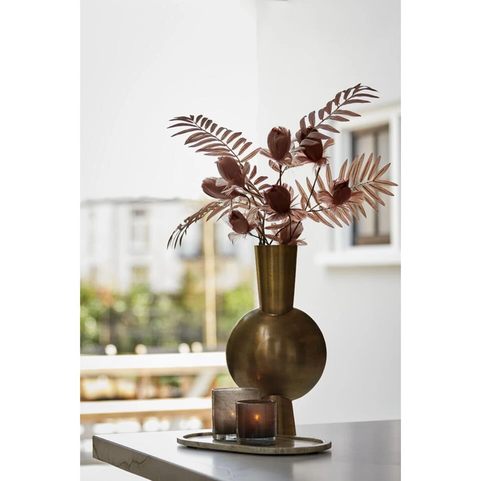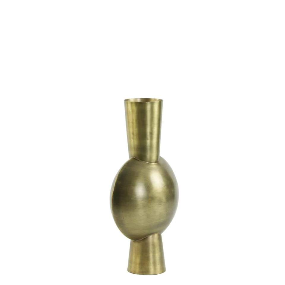 Heb je een paar mooie pluimen of een mooie grote tak? Combineer deze met vaas Kavandu van het Nederlandse merk Light & Living. De vaas heeft een luxe uitstraling door de antiek bronzen kleur. Doordat de vaas een niet al te grote opening heeft, zal hier geen volledige bos bloemen in passen. De vaas loopt van smal naar breed en weer smal. Met deze unieke vorm maak je gegarandeerd een statement in jouw interieur! Plaats de vaas op de eettafel of als eyecatcher in de vensterbank. De afmeting van dit product is Ø13,5×39,5 cm.