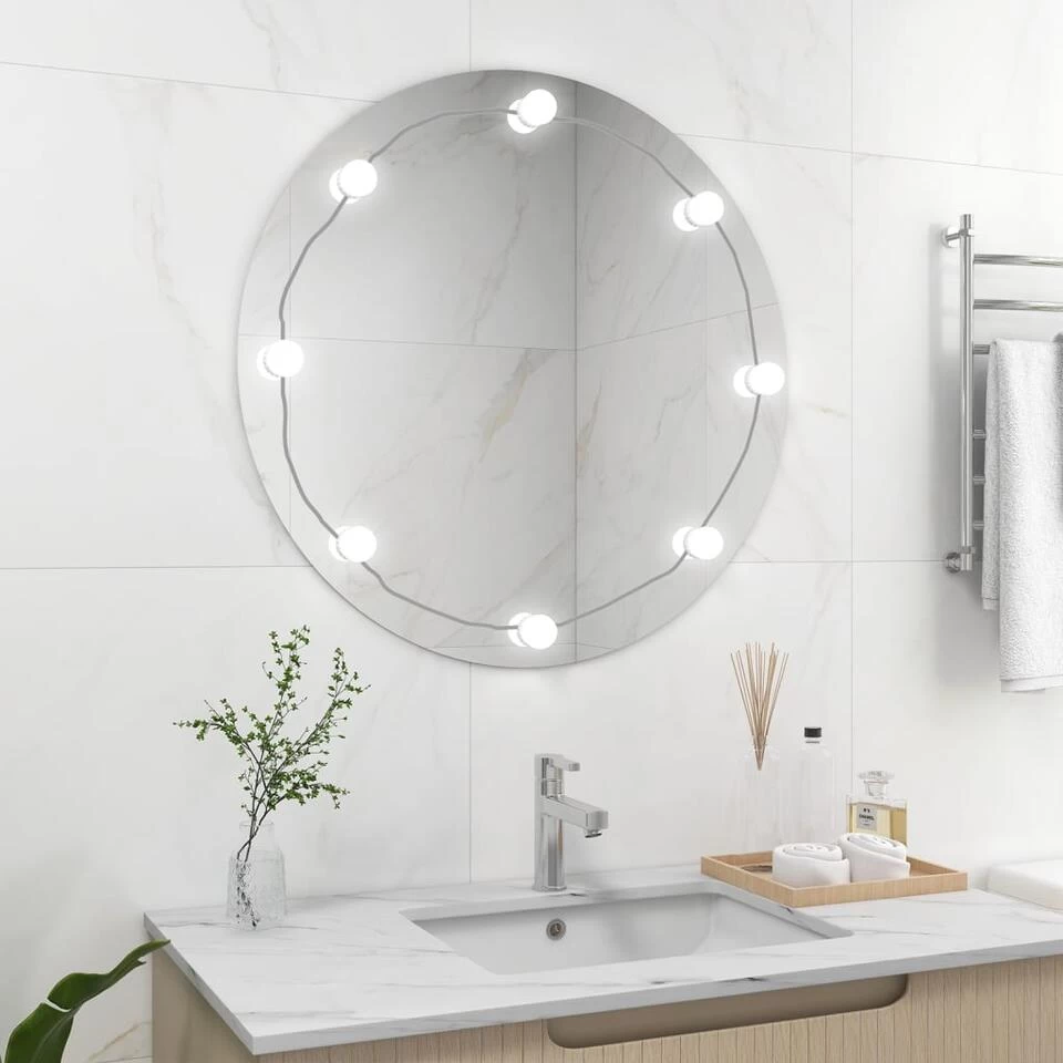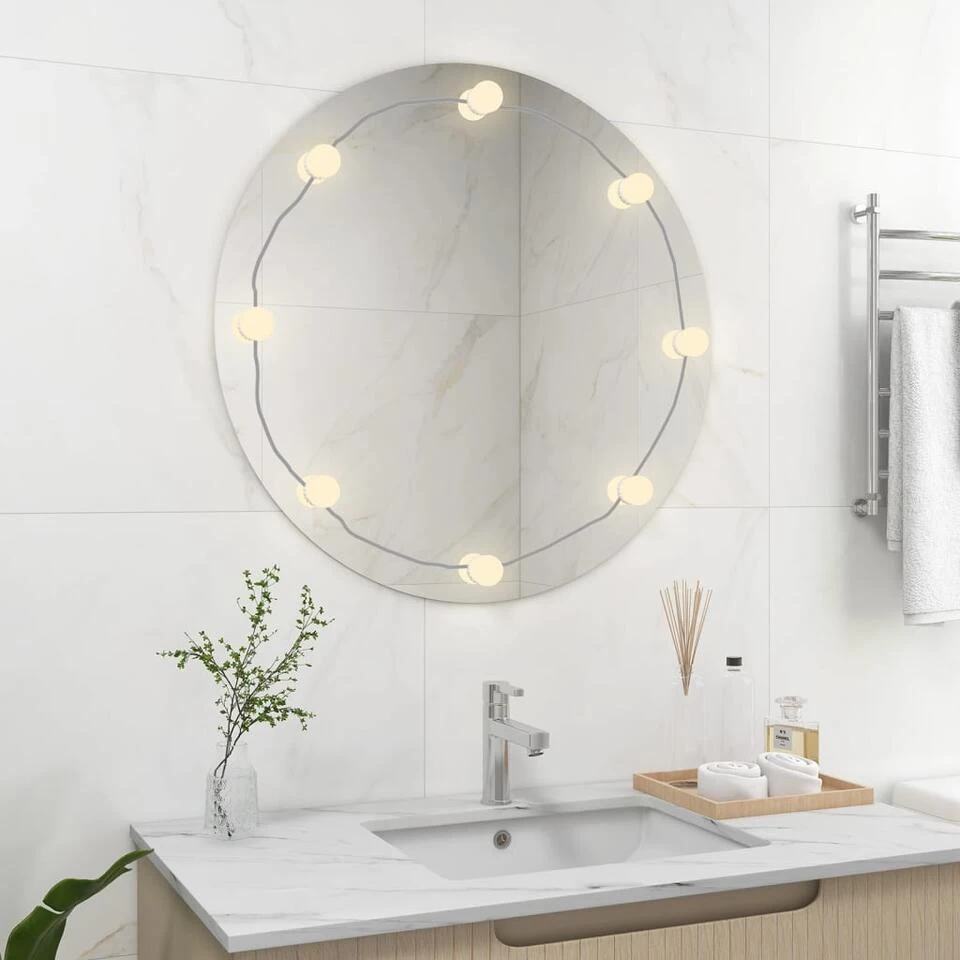 De spiegelrand is geslepen, waardoor hij een strakke uitstraling heeft. Je kunt ook meerdere spiegels aanschaffen en deze in een decoratief patroon ophangen. De zelfklevende make-upverlichting heeft verschillende kleurinstellingen voor verschillende doeleinden, afhankelijk van je behoeften. Vanwege de lege ruimtes tussen twee lampen is overtollig draad onzichtbaar weg te werken door deze om de onderkant van de LED-peertjes te wikkelen. Op die manier verkrijg je het beste doe-het-zelfeffect en een strakke en naadloze spiegel.