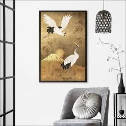 Ingelijste Poster Kraanvogels 93×63 Cm Goudkleurig