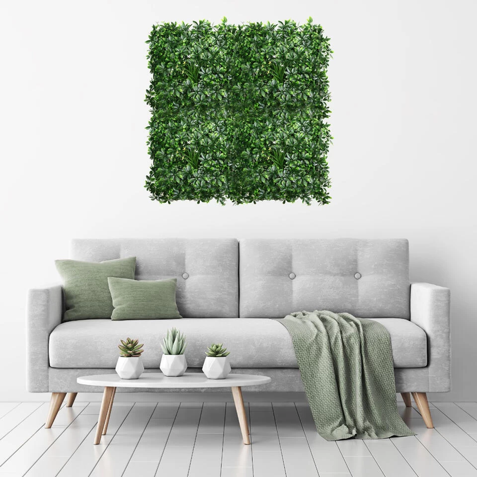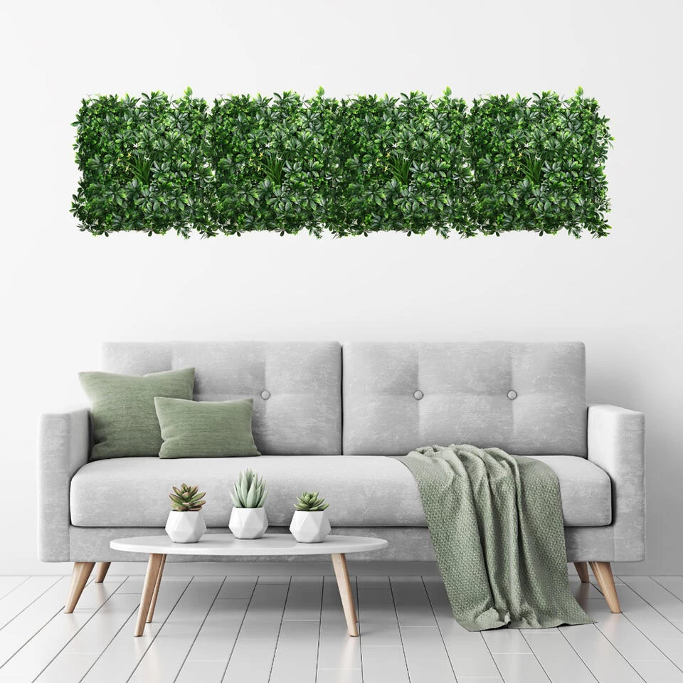 Deze decoratieve wandpanelen zijn bedekt met kunsthaag laurierblad. Ze kunnen gebruikt worden voor verschillende ruimtes en gelegenheden. De panelen hebben vrijwel geen onderhoud nodig, omdat de bladeren kunstmatig zijn.